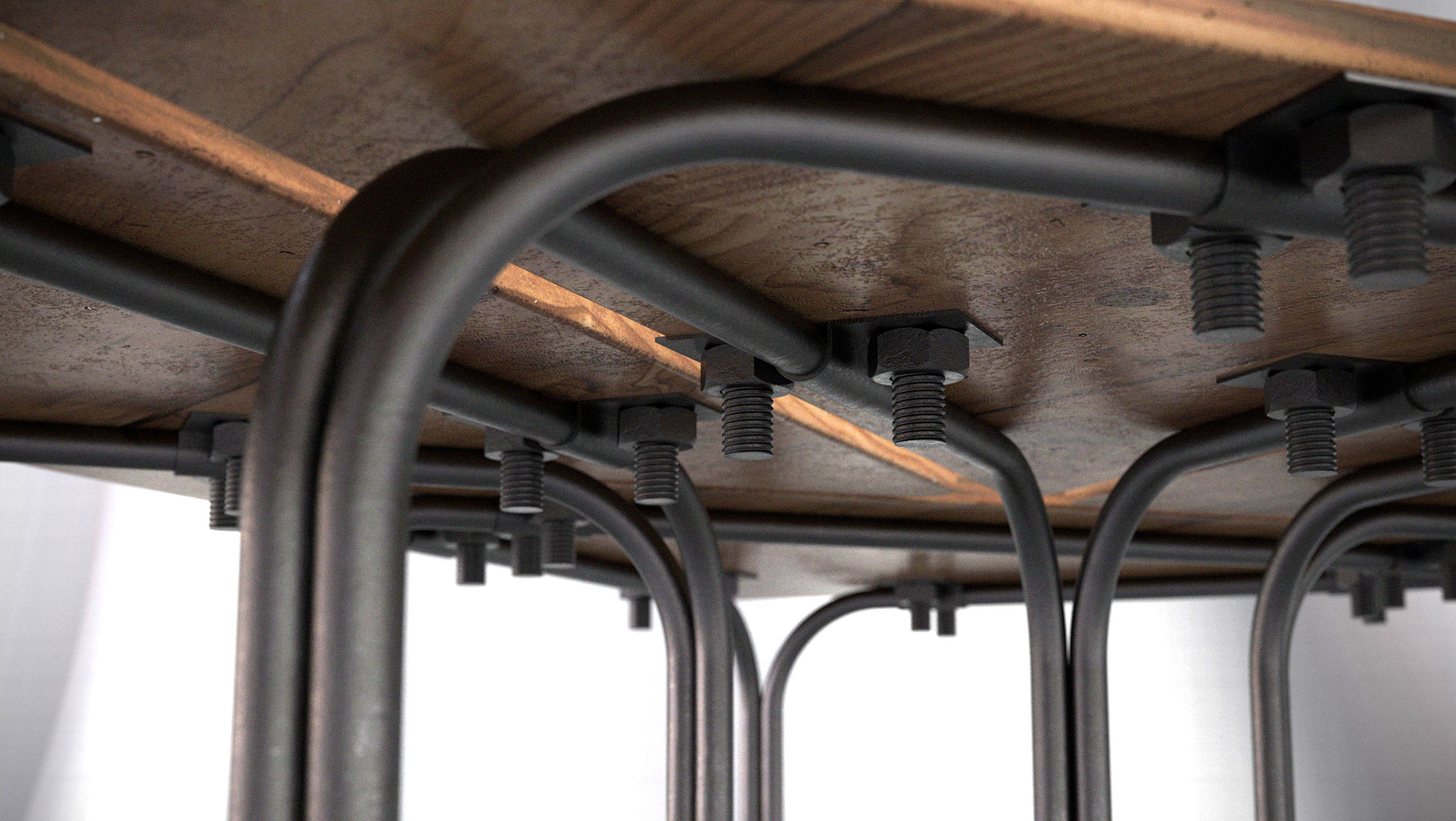 Four sets were made painted in different colour. Dimension was 1x1 metre each when arranged in a square. "U clips" connected mild steel rods and wood together.